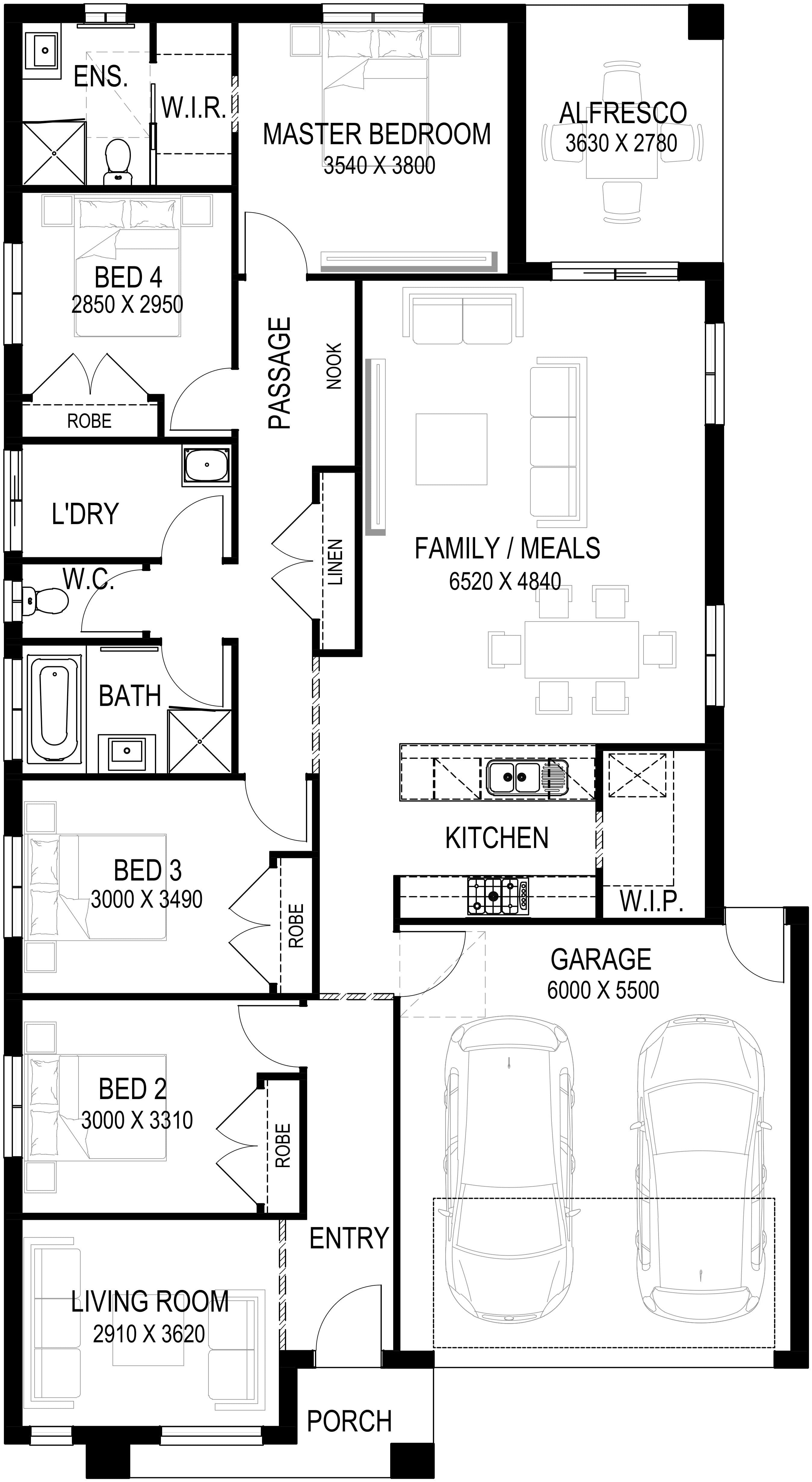 Campbell 23 is designed for families who love open living and smart design. Featuring four bedrooms, including a master suite with walk-in robe and ensuite, this home provides both comfort and privacy. The open-plan kitchen, meals, and family area forms the heart of the home, flowing seamlessly to the alfresco for effortless entertaining. With a separate living room, walk-in pantry, and double garage, the Campbell balances style with everyday practicality.