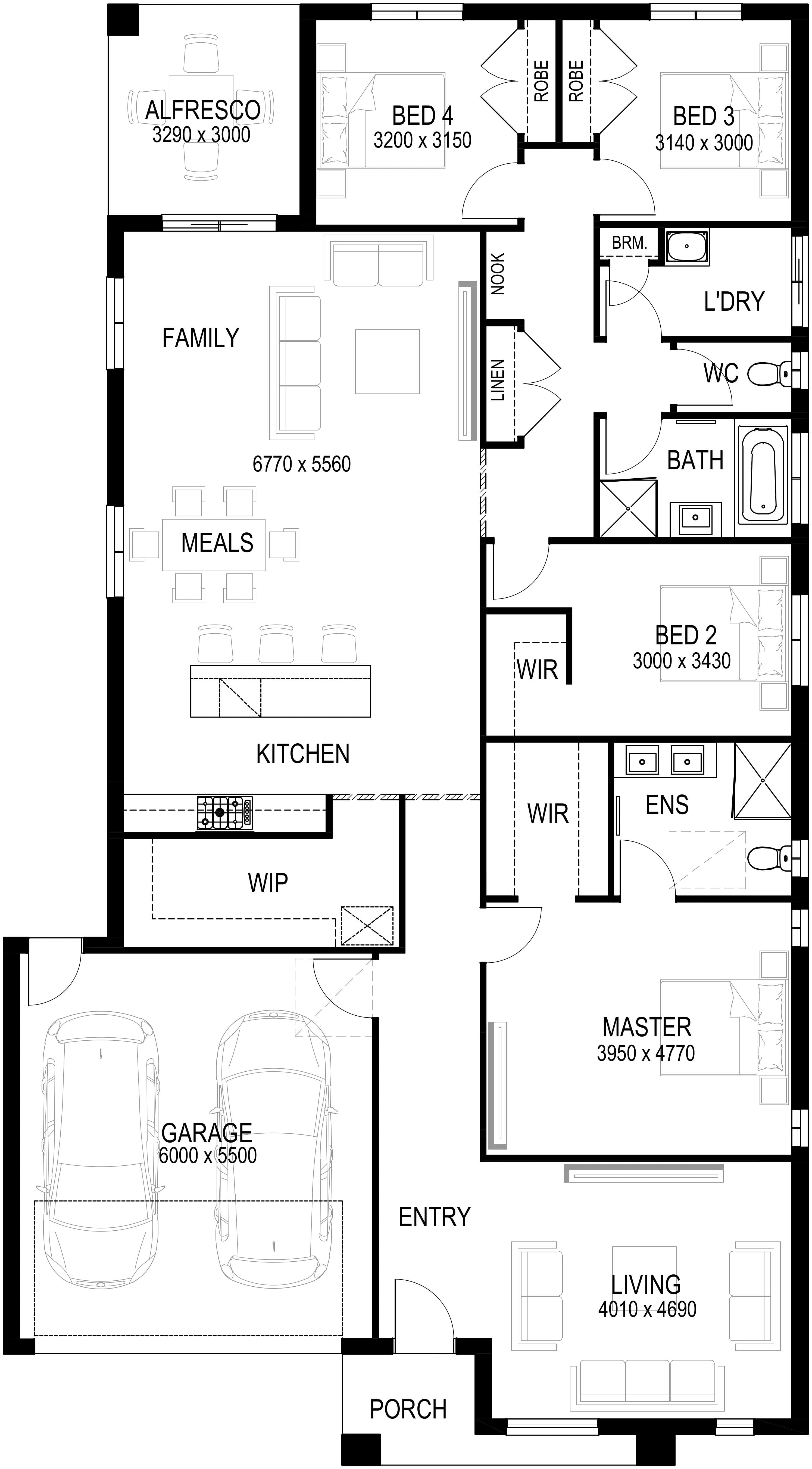 Cooper 27 combines space, style, and practicality for modern family living. Featuring four generous bedrooms, including a private master suite with dual walk-in robes and ensuite, this design caters to both comfort and convenience. The open-plan kitchen with walk-in pantry flows into the expansive meals and family area, extending to the alfresco for easy entertaining. A separate living room and double garage add flexibility, making the Cooper a perfect fit for families who want it all.