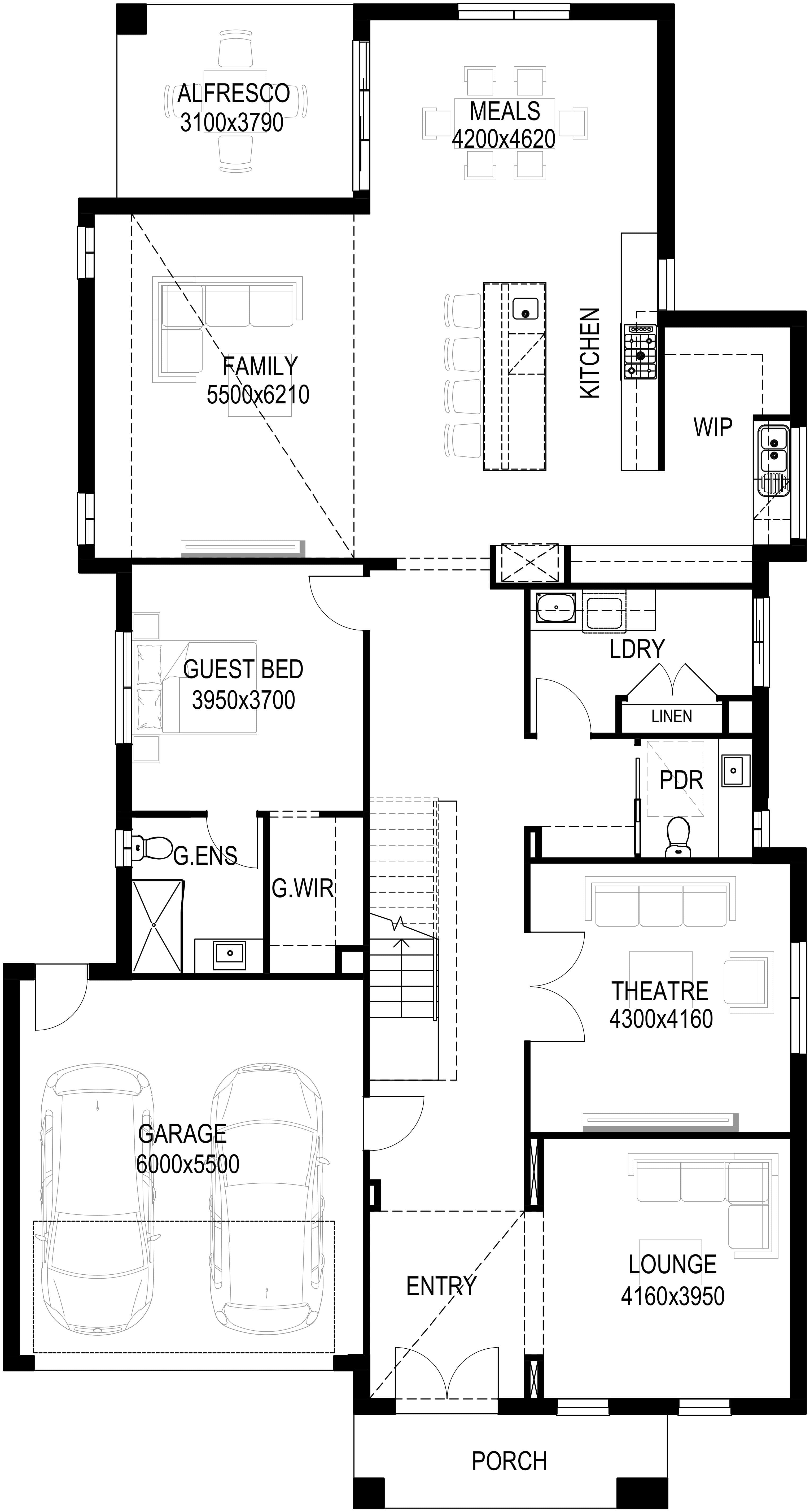 Thoughtfully crafted for families who value space and privacy, the Geneva 52 offers a perfect balance of generous living zones and private bedroom suites across two levels. With multiple lounges, a theatre, a study, and an open-plan living hub flowing to the alfresco, it’s designed for effortless everyday living and entertaining. A full guest suite on the ground floor makes multi-generational living easy, while upstairs, a grand master retreat with dual walk-in robes sits alongside three additional bedrooms, each with its own ensuite and WIR ensuring comfort and independence for all. The Geneva 52 blends practicality, elegance, and family-focused design.