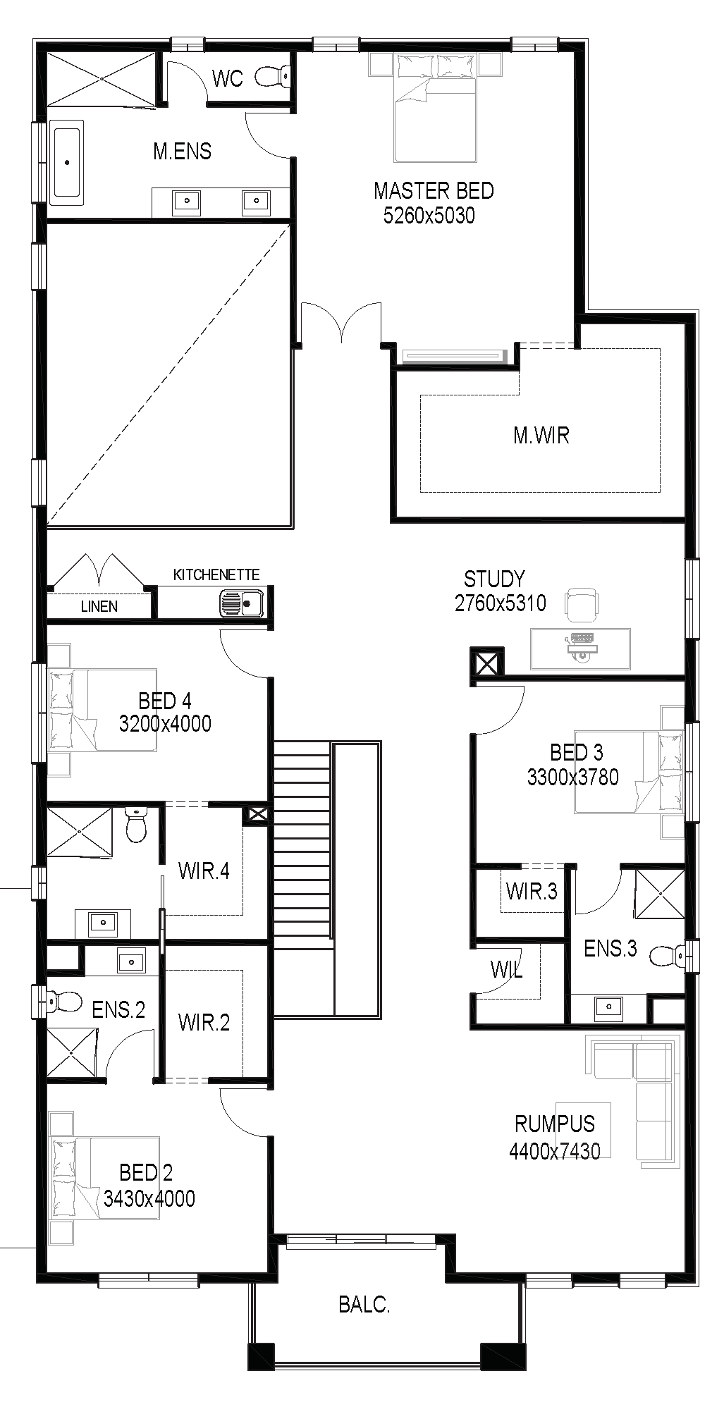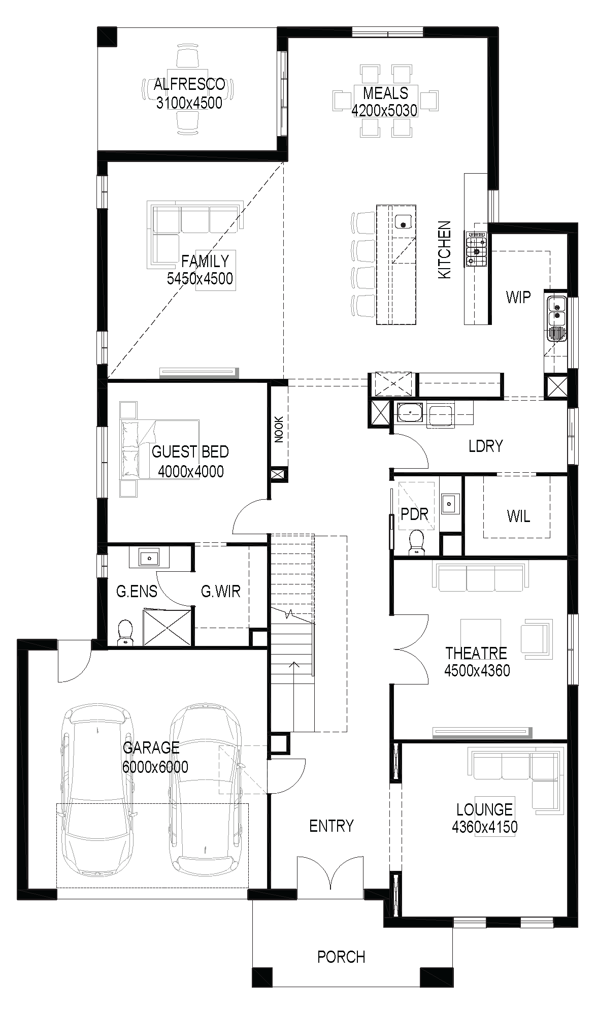 Designed for space and versatility, the Geneva 58 offers multiple living zones, a theatre, a study, and an open-plan hub that connects to the alfresco. A full guest suite on the ground floor enhances flexibility, while upstairs features a master retreat and three additional ensuite bedrooms, each with its own walk-in-robe. A central rumpus and kitchenette complete a layout tailored for modern family living.