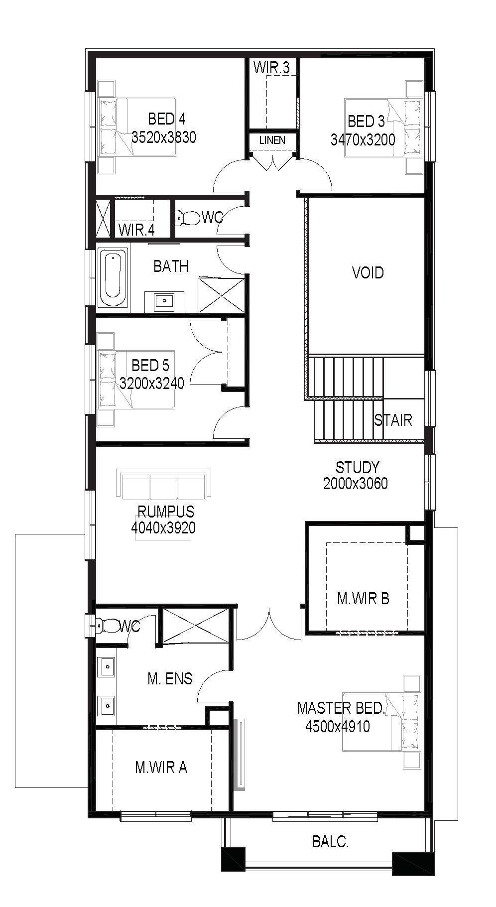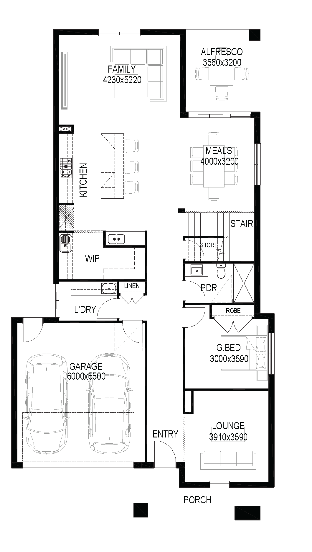 The Legacy 40 is a spacious double-storey home designed for modern family living. With five bedrooms including a ground-floor guest suite and a private upstairs master retreat, it offers flexibility for growing families. An open-plan kitchen with walk-in pantry flows into the meals and family area, extending to the alfresco, while a separate lounge, rumpus, and study provide multiple living zones.