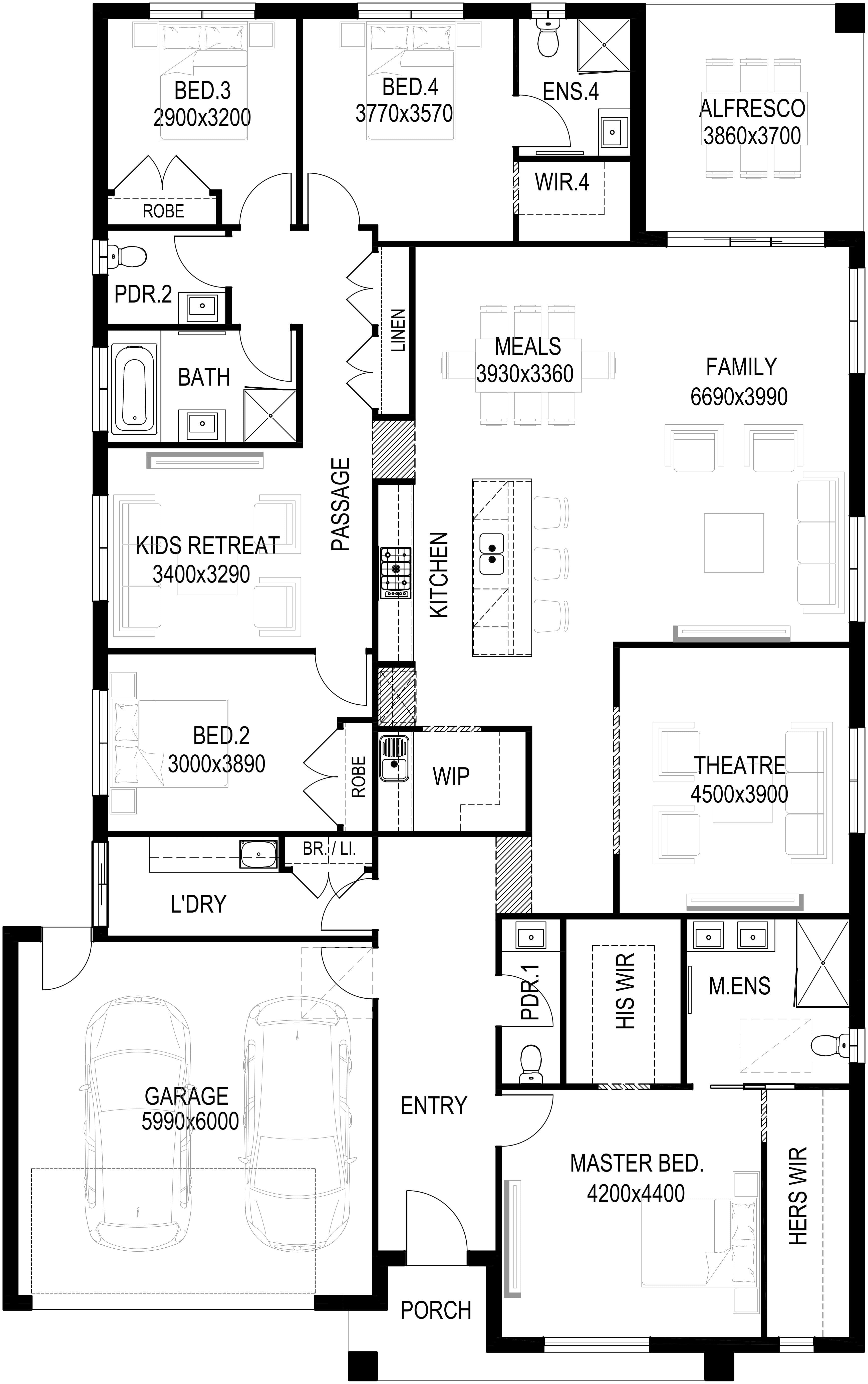 Nepean 33 is designed for families who want it all - space, style, and flexibility. With four generous bedrooms, a private master suite with dual walk-in robes, and an additional ensuite for Bedroom 4, it’s built for both comfort and convenience. Multiple living zones - including a theatre, kids’ retreat, and expansive open-plan family/meals area - mean everyone has room to unwind their way. The gourmet kitchen, complete with walk-in pantry, sits at the heart of the home, seamlessly flowing to the alfresco for effortless entertaining.