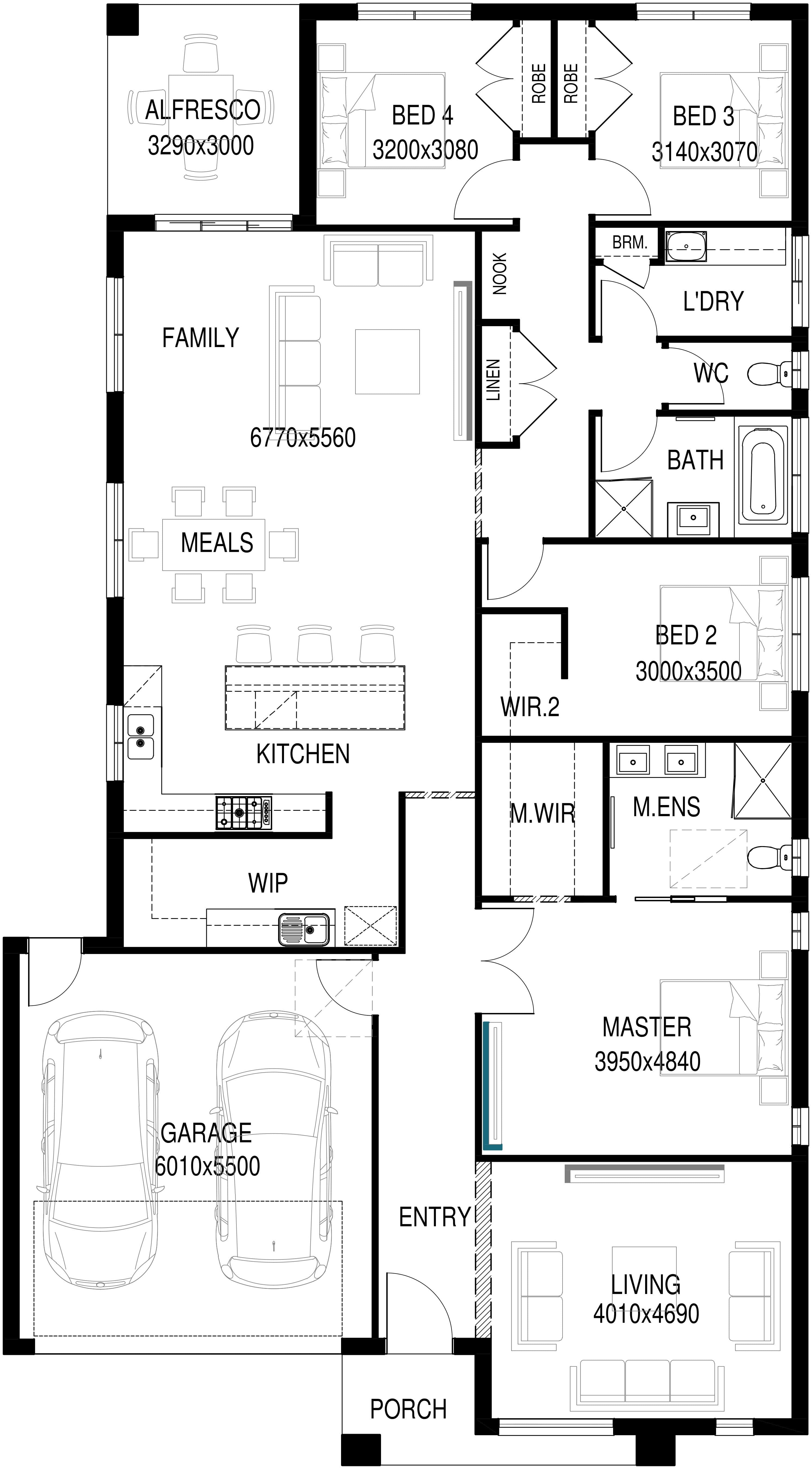 The Parkers' combines space and functionality with smart zoning. A large master suite with dual walk-in robes and ensuite sits at the front beside a separate lounge. The central open-plan kitchen, meals and family area leads to the alfresco, while three additional bedrooms are grouped with their own bathroom for balance.