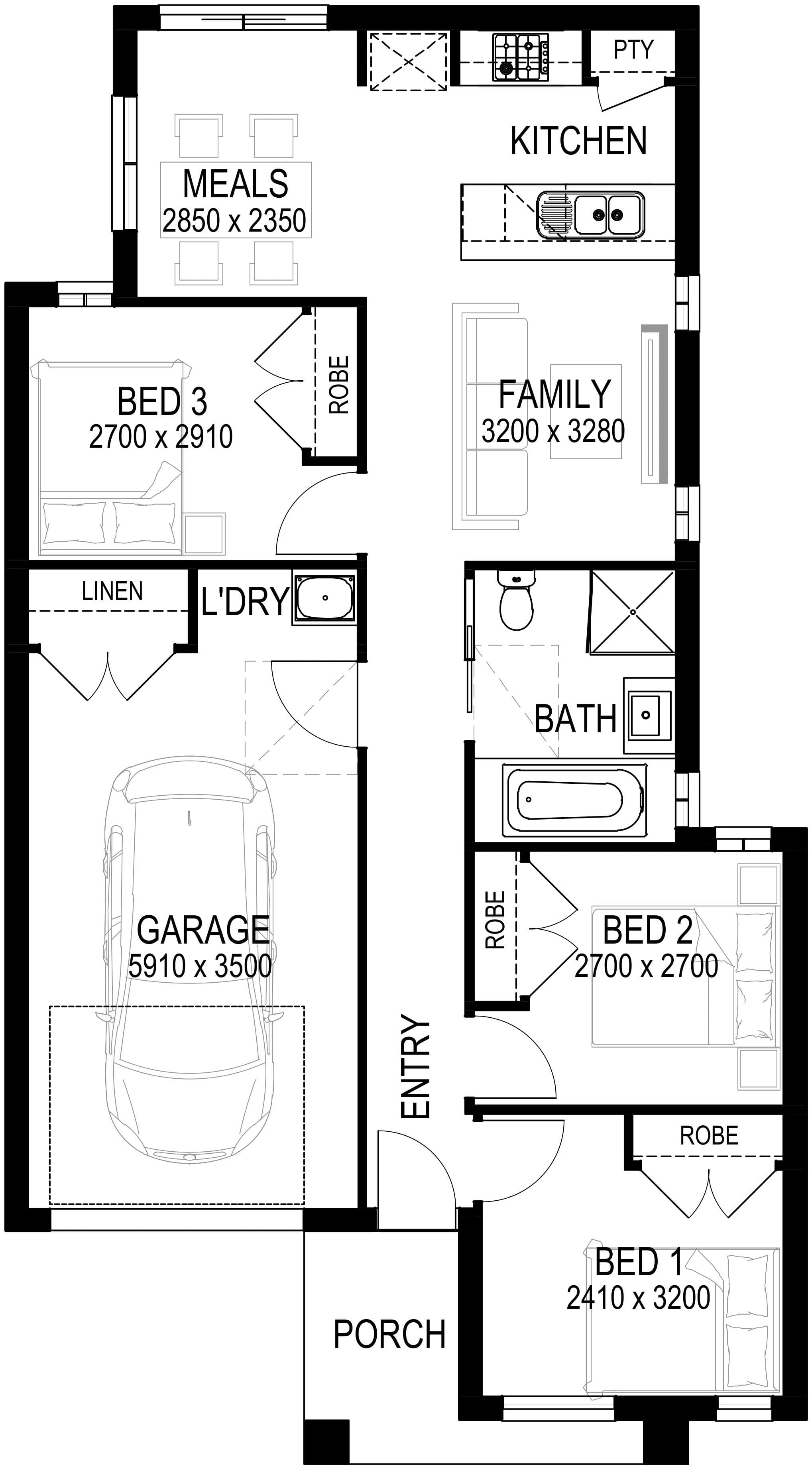 Selwyn 12 is a smart and efficient design, perfect for young families or downsizers. Offering three bedrooms with built-in robes, this home balances practicality with modern style. The open-plan kitchen, meals, and family area form the central hub, making everyday living effortless. With a double garage, dedicated laundry, and thoughtful storage throughout, the Selwyn delivers comfort and convenience in a compact footprint.
